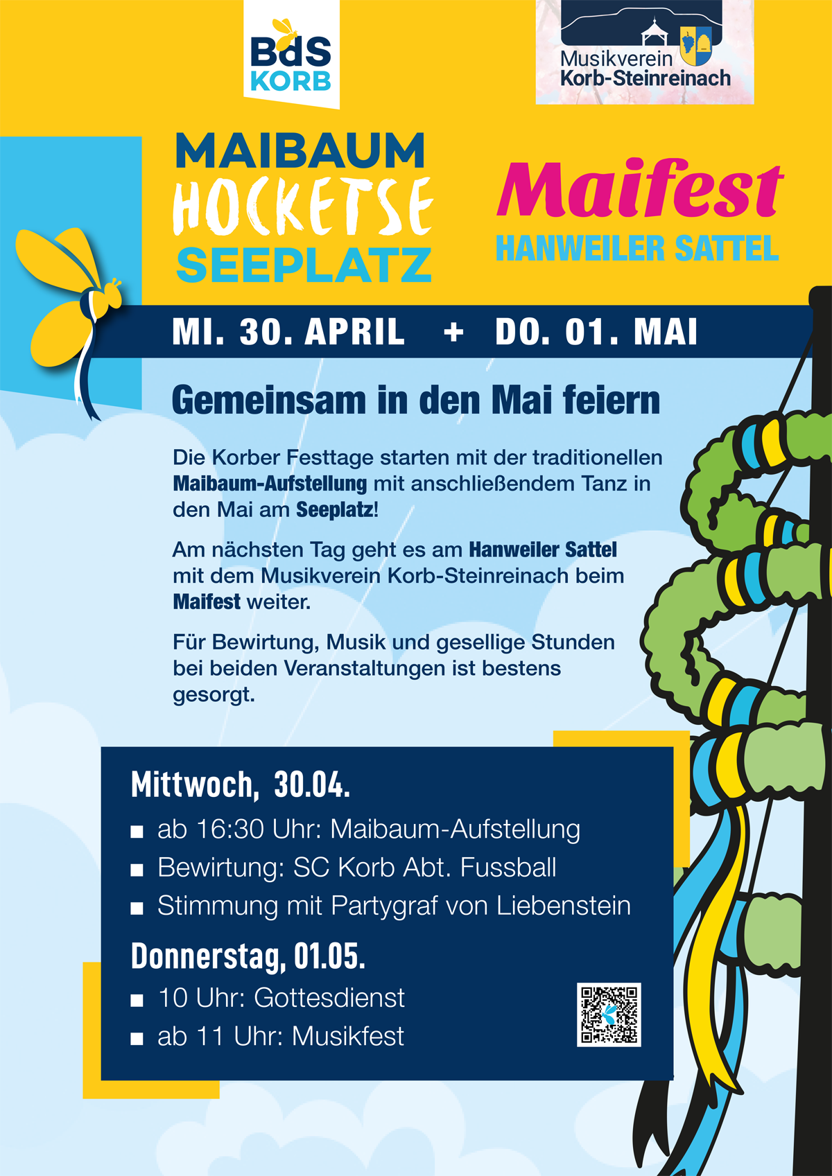 Gemeinsam in den Mai tanzen: Dies können Sie bereits am Mittwoch, 30. April, ab 16:30 Uhr. Die Korber Festtage starten dann auf dem Seeplatz mit unserer traditionellen Maibaum-Hocketse/-Aufstellung mit anschließendem Tanz in den Mai. Für die musikalische Stimmung sorgt der Partygraf von Liebenstein. Zusätzlich erwarten Sie leckere Speisen-/Getränkeangebote. Dafür und für die Organisation ist die Fußballabteilung des SC Korb zuständig. Wer dann immer noch in Feststimmung ist zieht am Donnerstag, 1. Mai, weiter auf den Hanweiler Sattel. Nach einem feierlichen Gottesdienst um 10:00 Uhr startet anschließend das stimmungsvolle Maifest mit dem Musikverein Korb-Steinreinach. Auch dort vor Ort können Sie sich auf köstliche Speisen und Getränke freuen.
